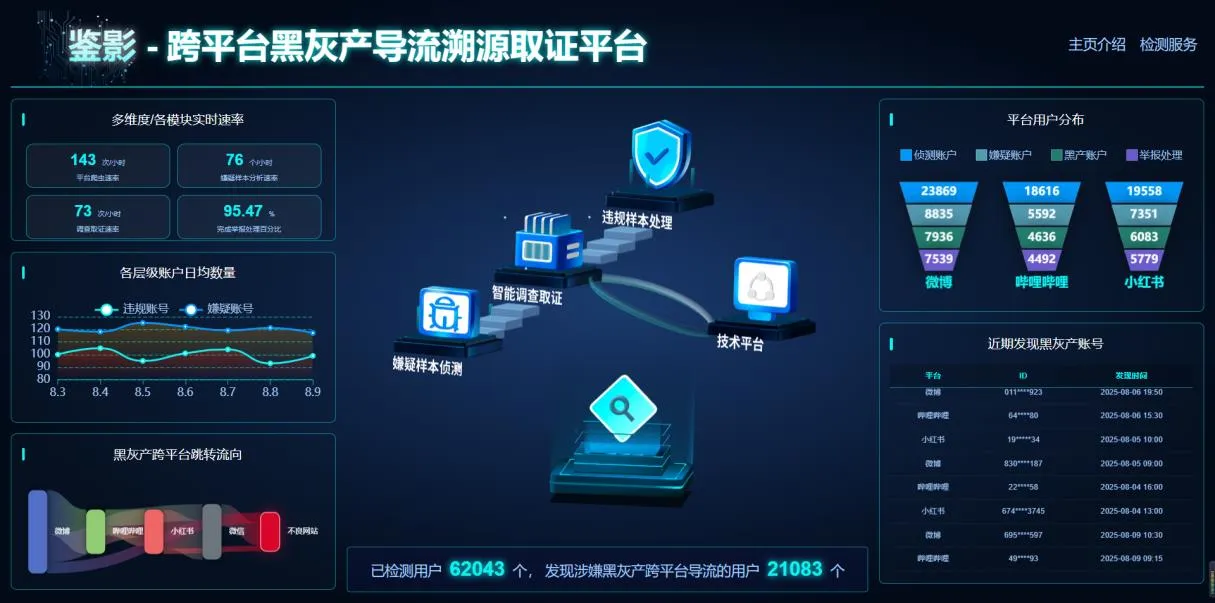 团队着眼于网络平台与监管部门的实际需求,对黑灰产行为进行深度研究,将跨平台用户行为链建模与动静态结合分析技术相融合,设计并研发了“鉴影”跨平台黑灰产溯源取证智能体,其核心优势在于能够模拟真实用户行为,对嫌疑路径进行深度探索与验证,从而将不同平台上的碎片化信息聚合成完整的证据链,精准还原黑灰产的运作全貌,最终实现从海量网络信息中主动发现黑灰产导流线索,并自动化地完成跨平台追踪、证据固定与行为链画像等一系列取证任务,为维护清朗网络空间、保障网络平台内容安全提供了可靠的技术支撑。