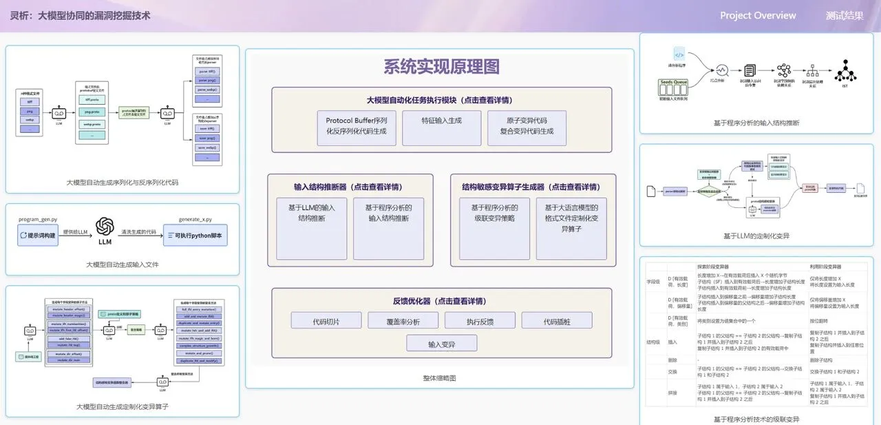 针对传统漏洞挖掘深度不足、效率低下的问题,团队开发“灵析:大模型协同的智能漏洞挖掘系统”,创新性融合大语言模型与程序分析技术,充分发挥大模型在语义理解与多格式泛化方面的优势,结合程序分析技术的精准可控特性,实现了自动化、结构感知的高效漏洞挖掘。在复杂文件格式测试中,灵析有效提升代码覆盖率与深层路径触发率,大幅减少无效测试输入,显著提高漏洞挖掘效率。系统基本实现全流程自动化,突破对人工定义文件格式的依赖。