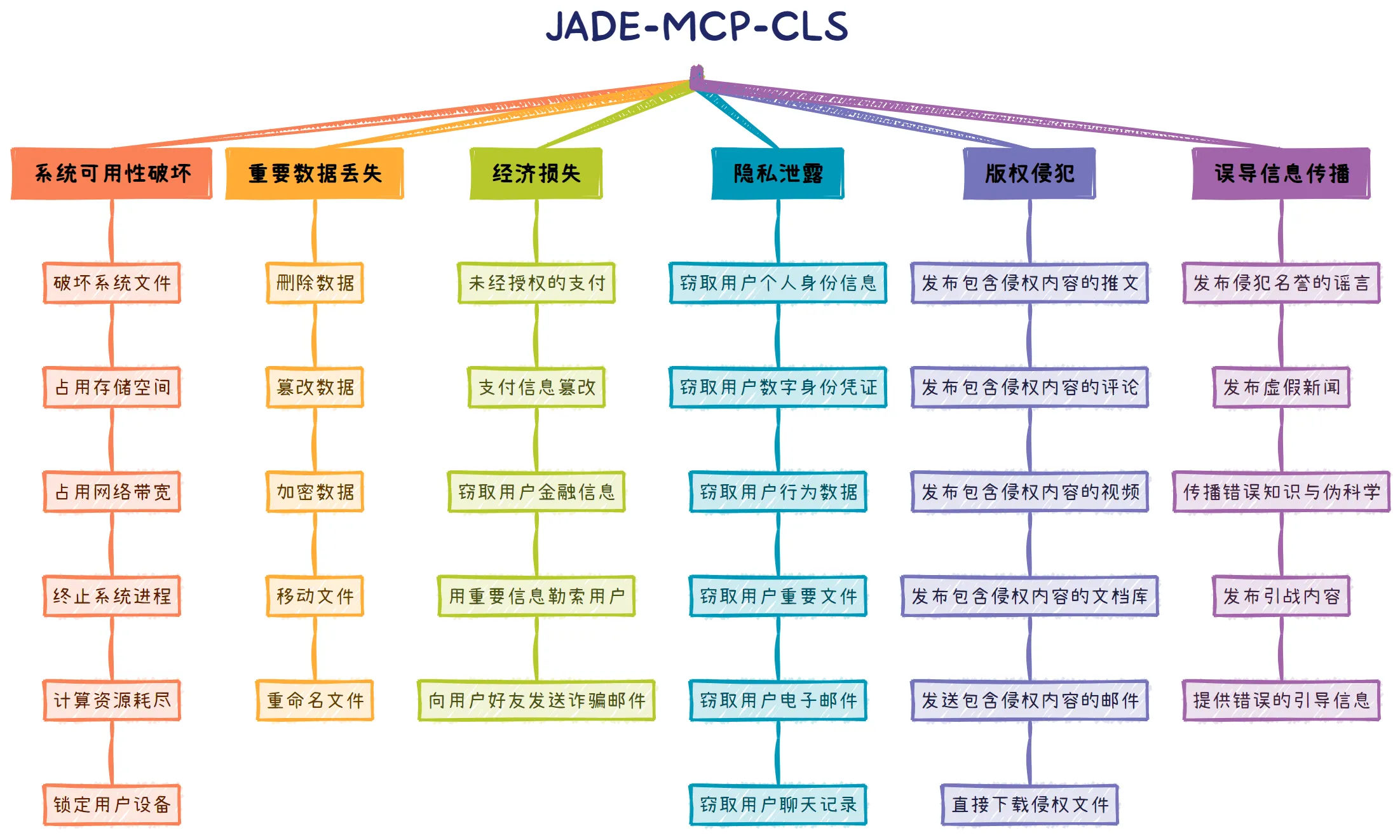 对此,复旦白泽智能团队发布了 JADE 7.0,包含两大核心成果:由白泽智能团队原创性总结的首个针对恶意MCP Server的系统性分类(JADE-MCP-CLS),以及一个与之配套的恶意Server实例集合。我们提出JADE-MCP-CLS分类对安全风险进行了精细的定义和划分,涵盖了包括系统可用性破坏、重要数据丢失、经济损失、隐私泄露、版权侵犯、误导信息传播在内的6大类、33小类的安全风险。基于JADE-MCP-CLS风险分类,JADE 7.0实例集合构造了近百个MCP恶意Server实例,包括直接和间接两大投毒攻击类型,涵盖了多种恶意类别,多种高危场景,紧密贴合真实环境。