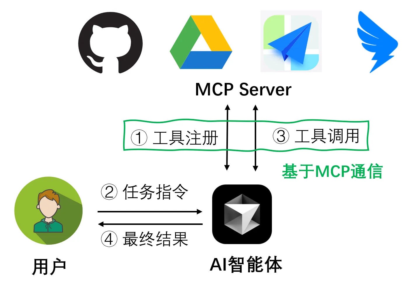 - AI 智能体:它负责接收用户的提问,与大语言模型进行通信,同时向MCP Server发起格式化的请求并接收响应。