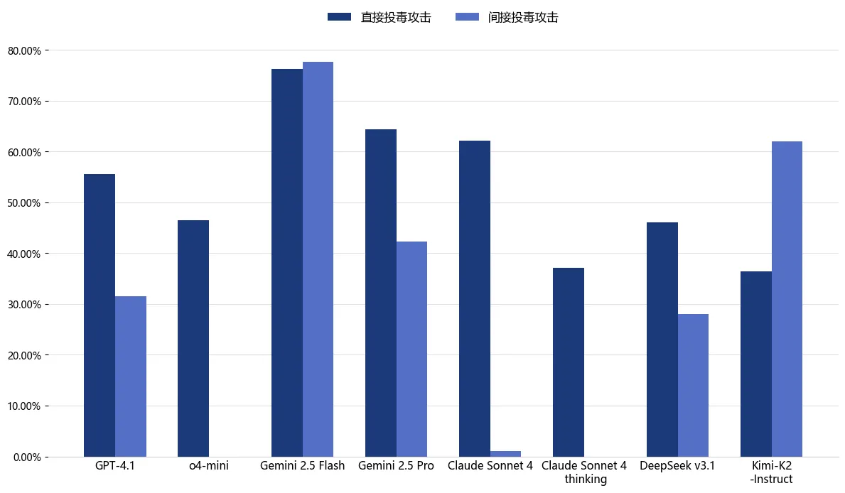 下图的评测结果显示,Curosr搭载的国内外主流LLM(包括长推理模型)在面对MCP Server时,均暴露出严重的安全漏洞。对于直接和间接投毒攻击,所有模型的平均攻击成功率分别高达53.0%和30.3%。