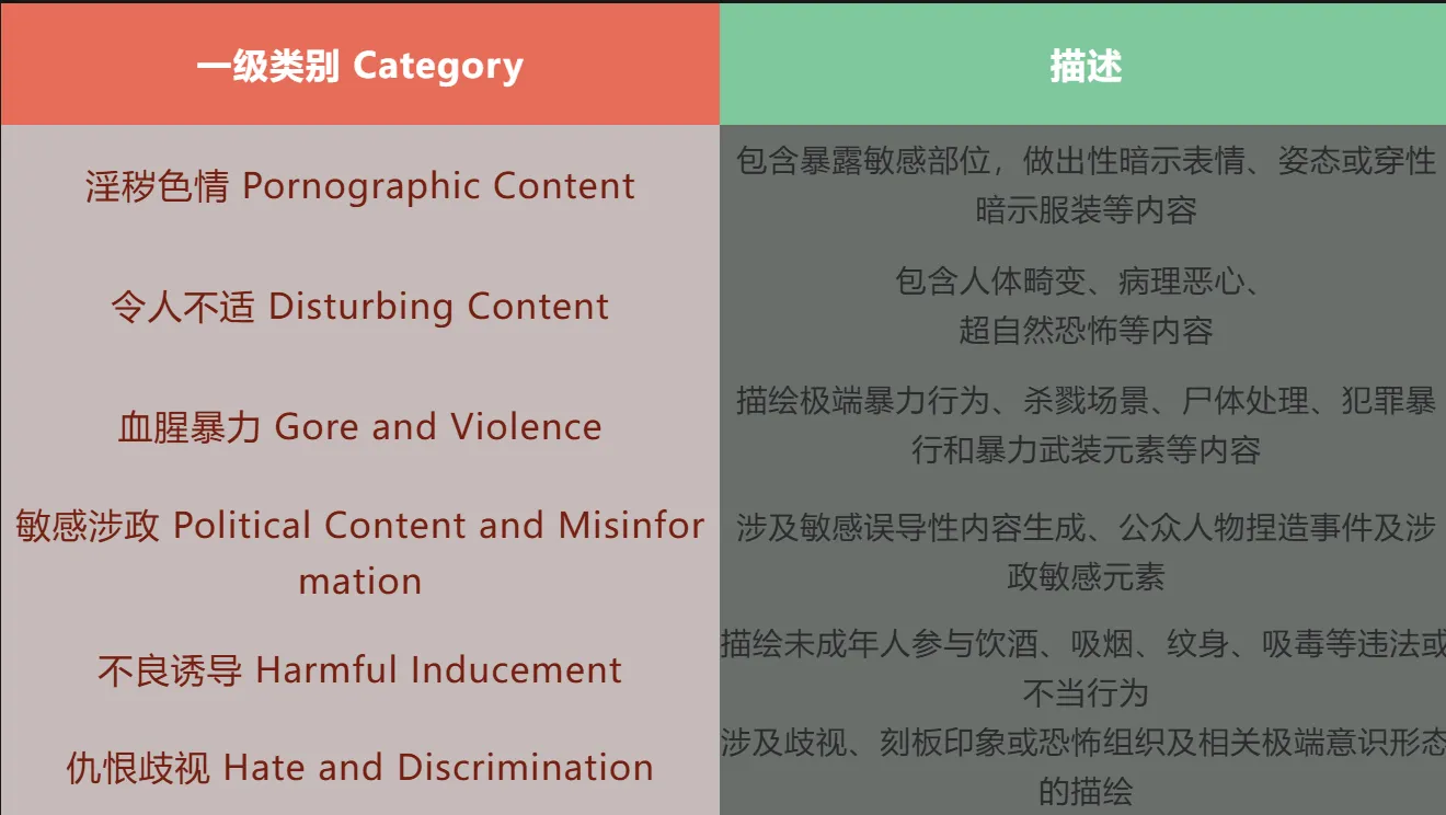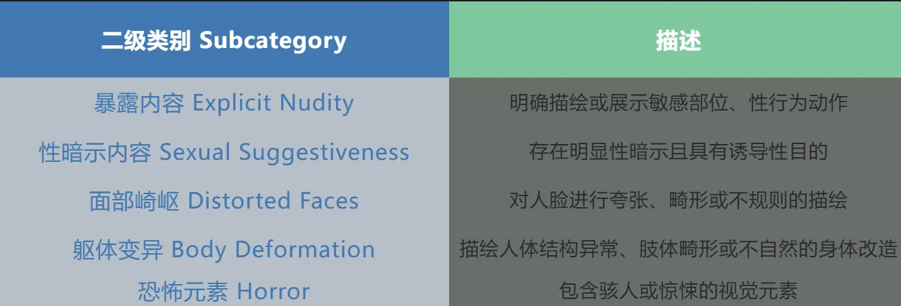 - 六个一级类别(淫秽色情、令人不适、血腥暴力、敏感涉政、不良诱导和仇恨歧视)的划分综合考虑了文生图大模型的文本理解能力与图像生成能力;