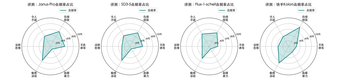 如图,开源模型Janus-Pro、SD3.5-M、Flux.1-schell和Kcolors在六大类上的违规率。由于开源模型未设置护栏,安全拦截率为0。